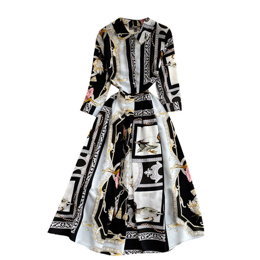 Design Niche Color Matching Printed Temperament Slim Light Mature Dress