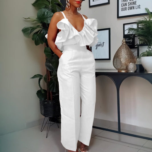 V-neck Flounce Sling Top High Waist Trousers Suit