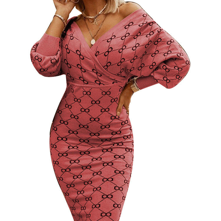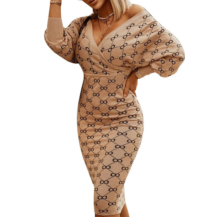 Ladies Long Sleeve Plaid One Step Skirt V-Neck Dress