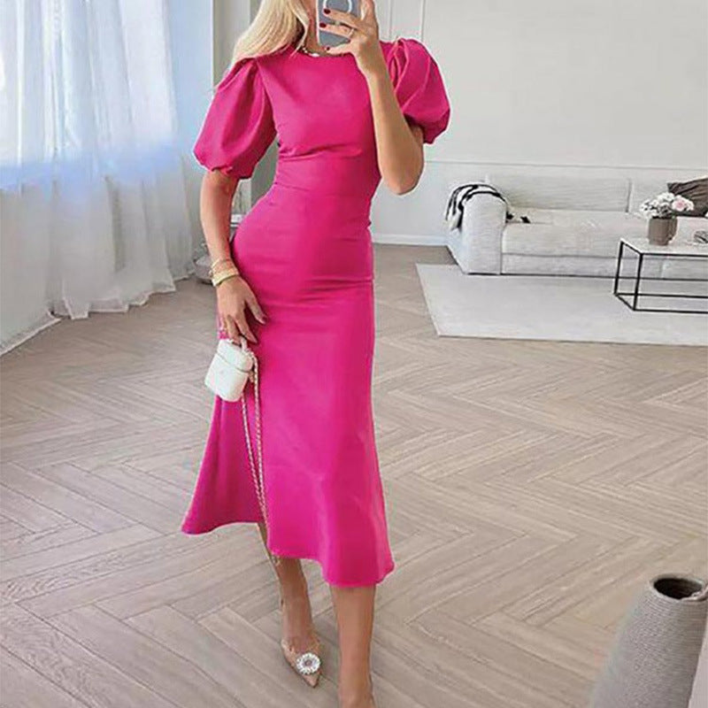 Lantern Sleeve Waist Trimming Fashion Slim Long Dress