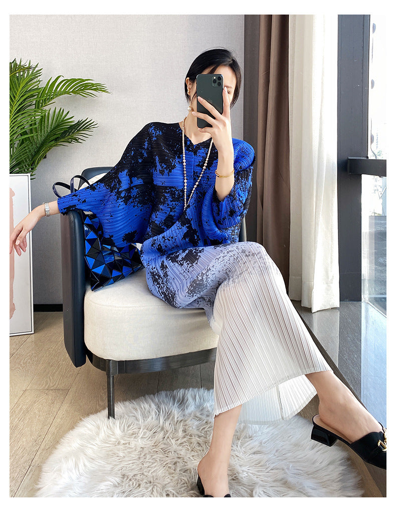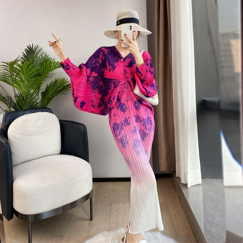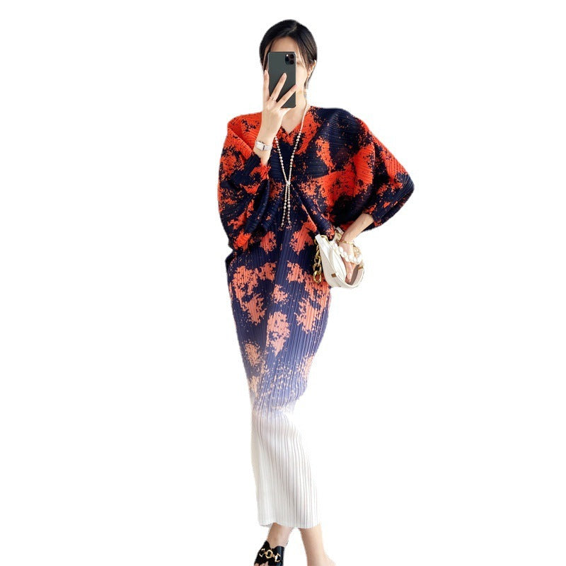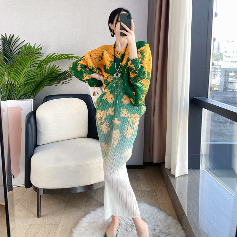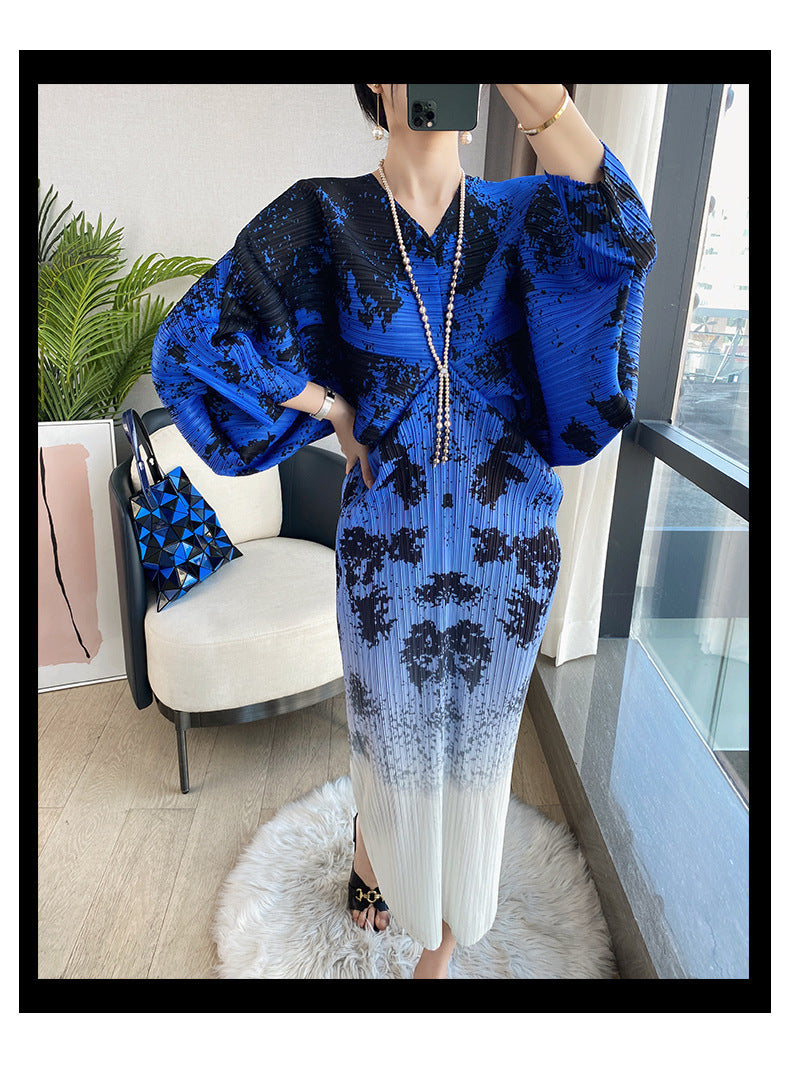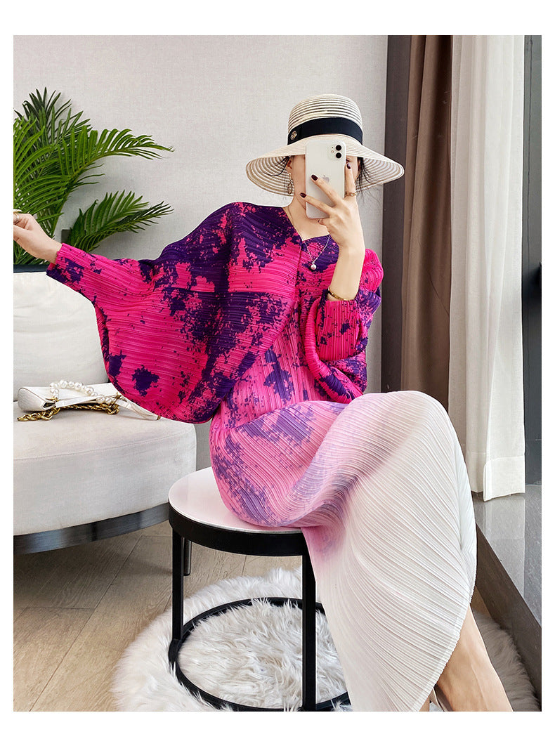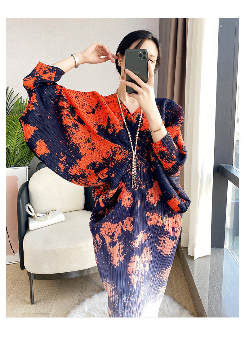 Women's Pleated Vintage Printed Batwing Sleeve Dress